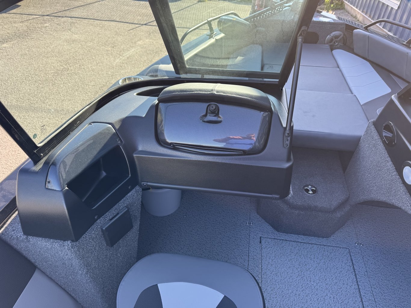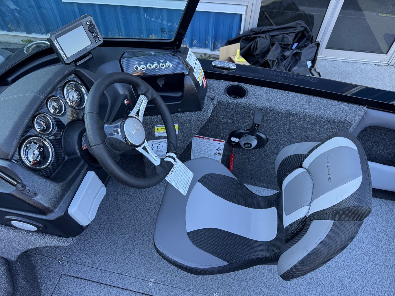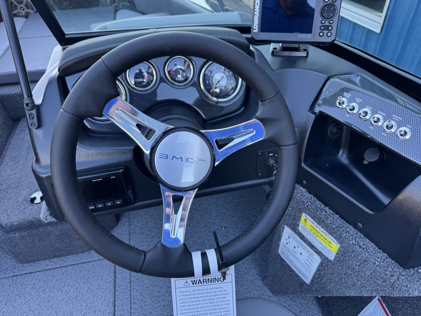 The solid helm of a Lowe Fish and Ski has cool looking accents, 4:1 anti-feedback steering, and a soft grip wheel. Sharp full-size tach, speed, fuel, volt & trim gauges – with room left for other devices. |