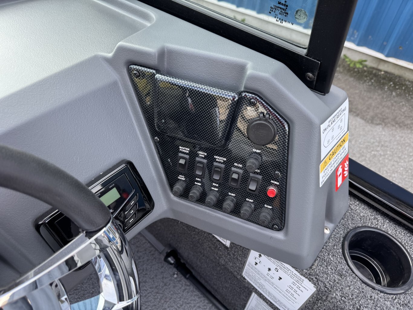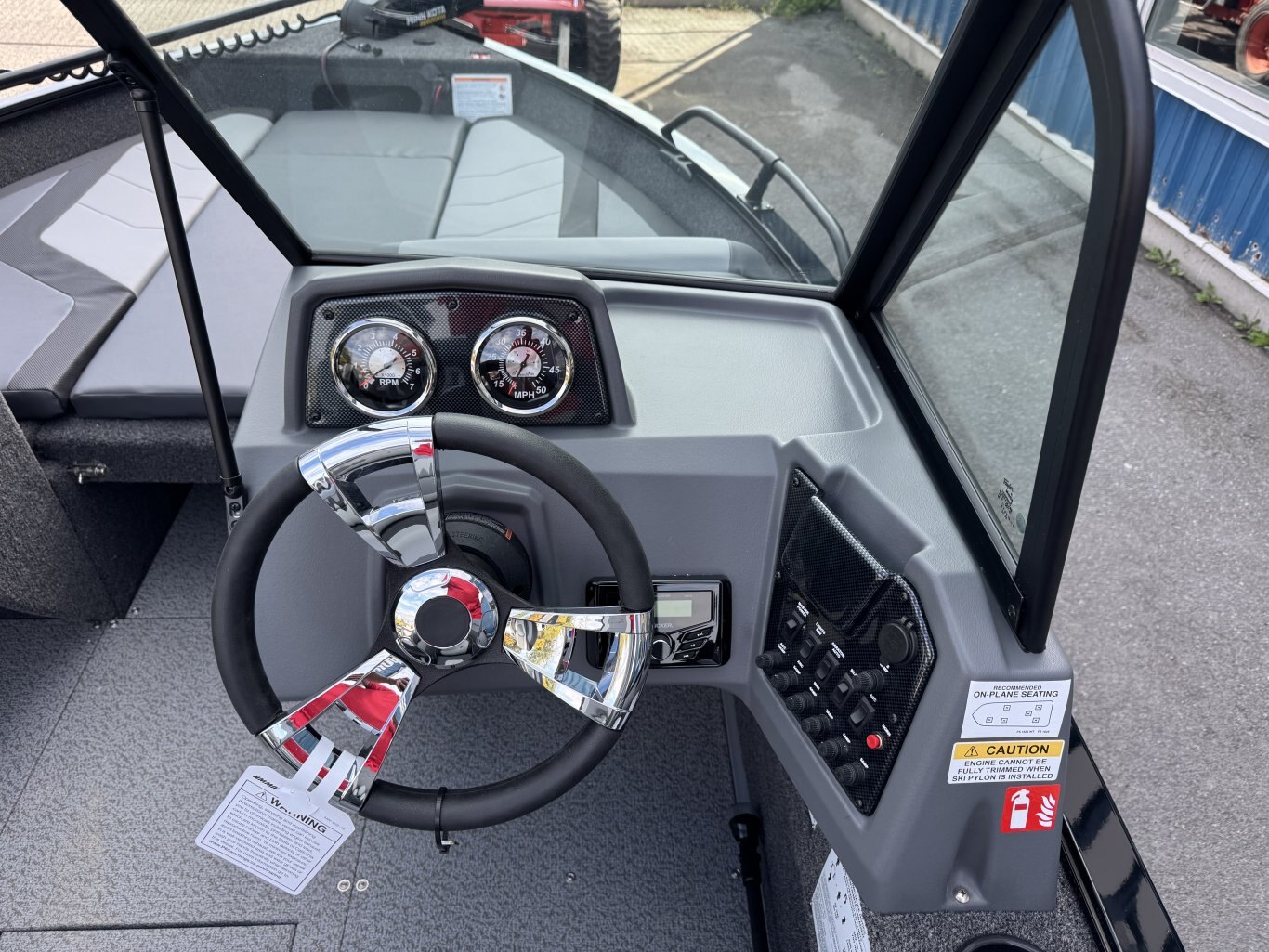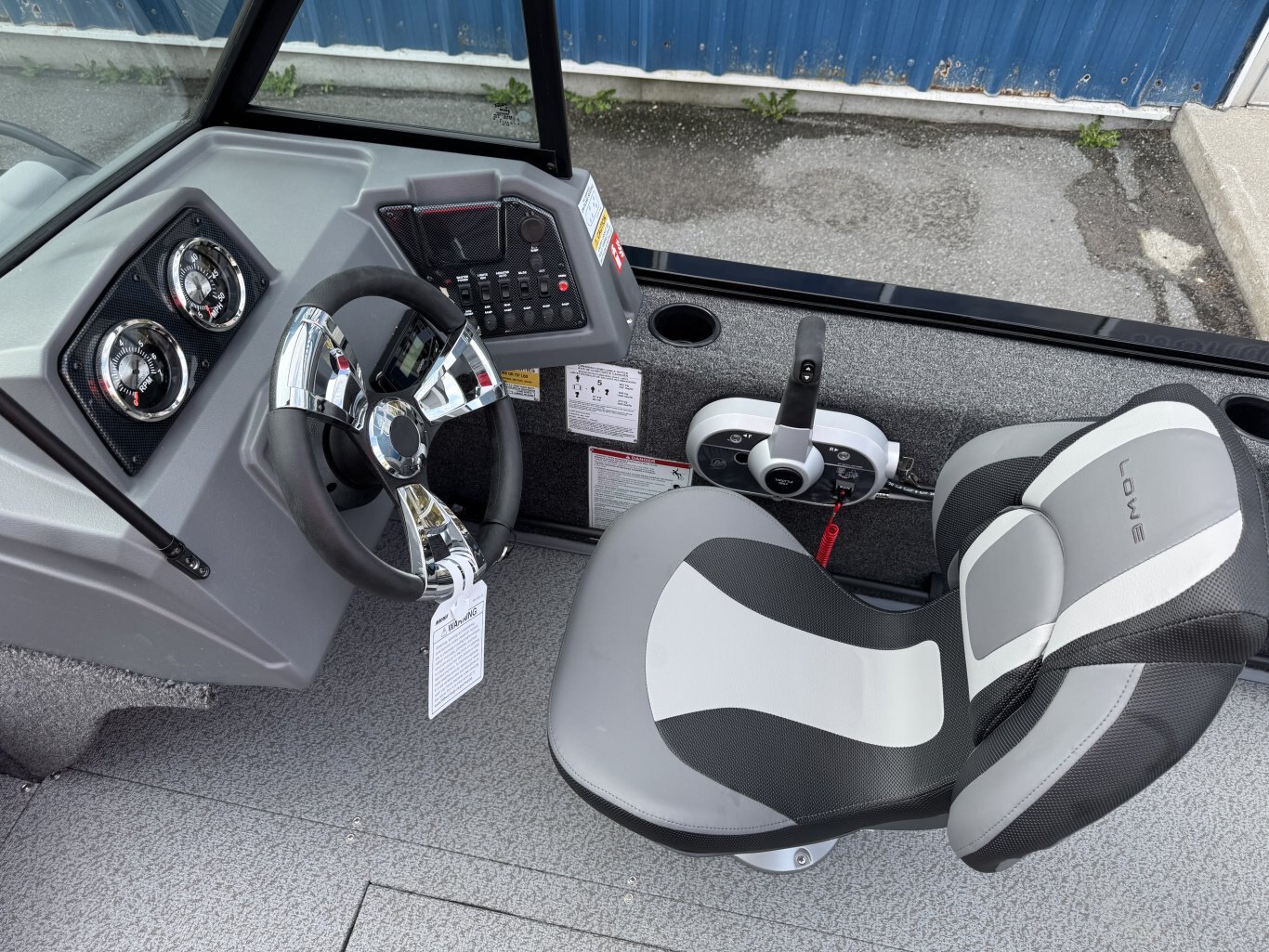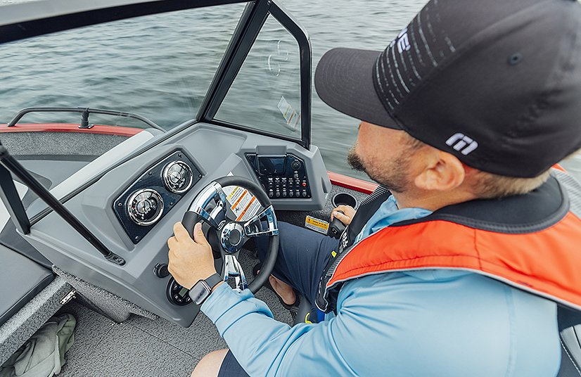 The solid helm of a Lowe Fish and Ski has cool looking accents, 4:1 anti-feedback steering, and a soft grip wheel. Sharp full-size tach, speed, fuel, volt & trim gauges – with room left for other devices.